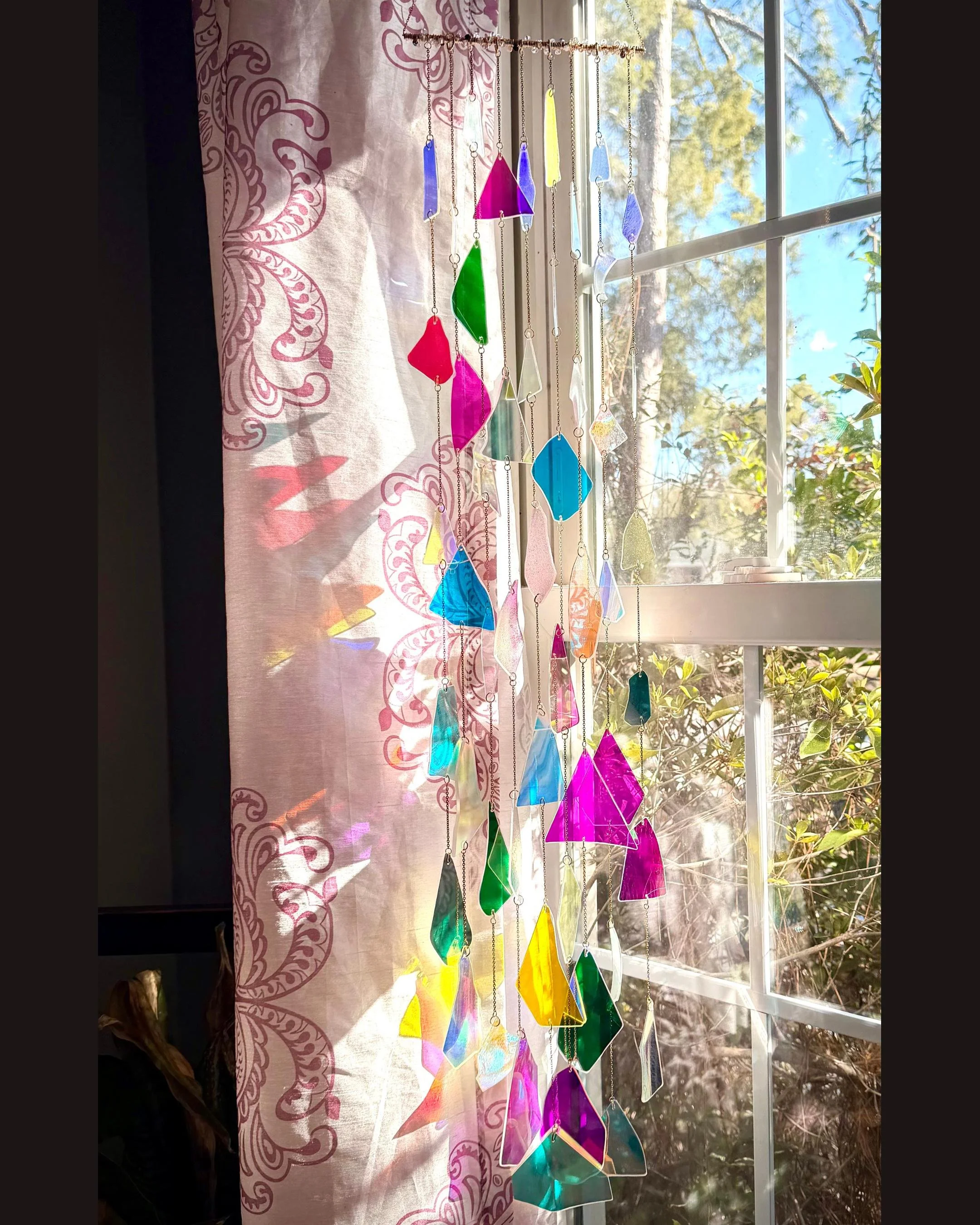 Details Handmade with hand-cut dichroic glass Color-shifting, light-catching movement Sparkles and casts rainbow reflections in sunlight Hung on a copper bar with a gold-tone chain One of a kind — no two are alike
