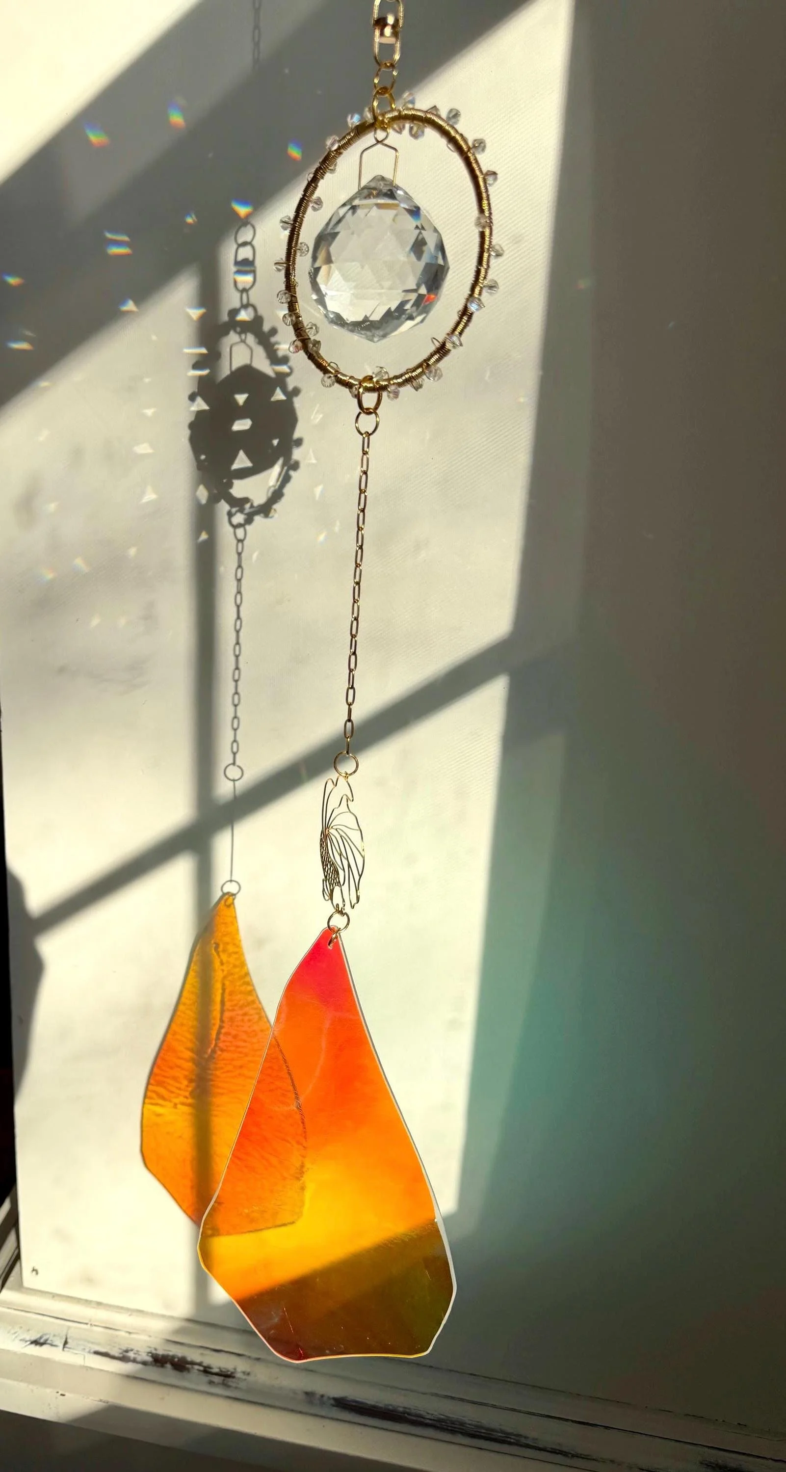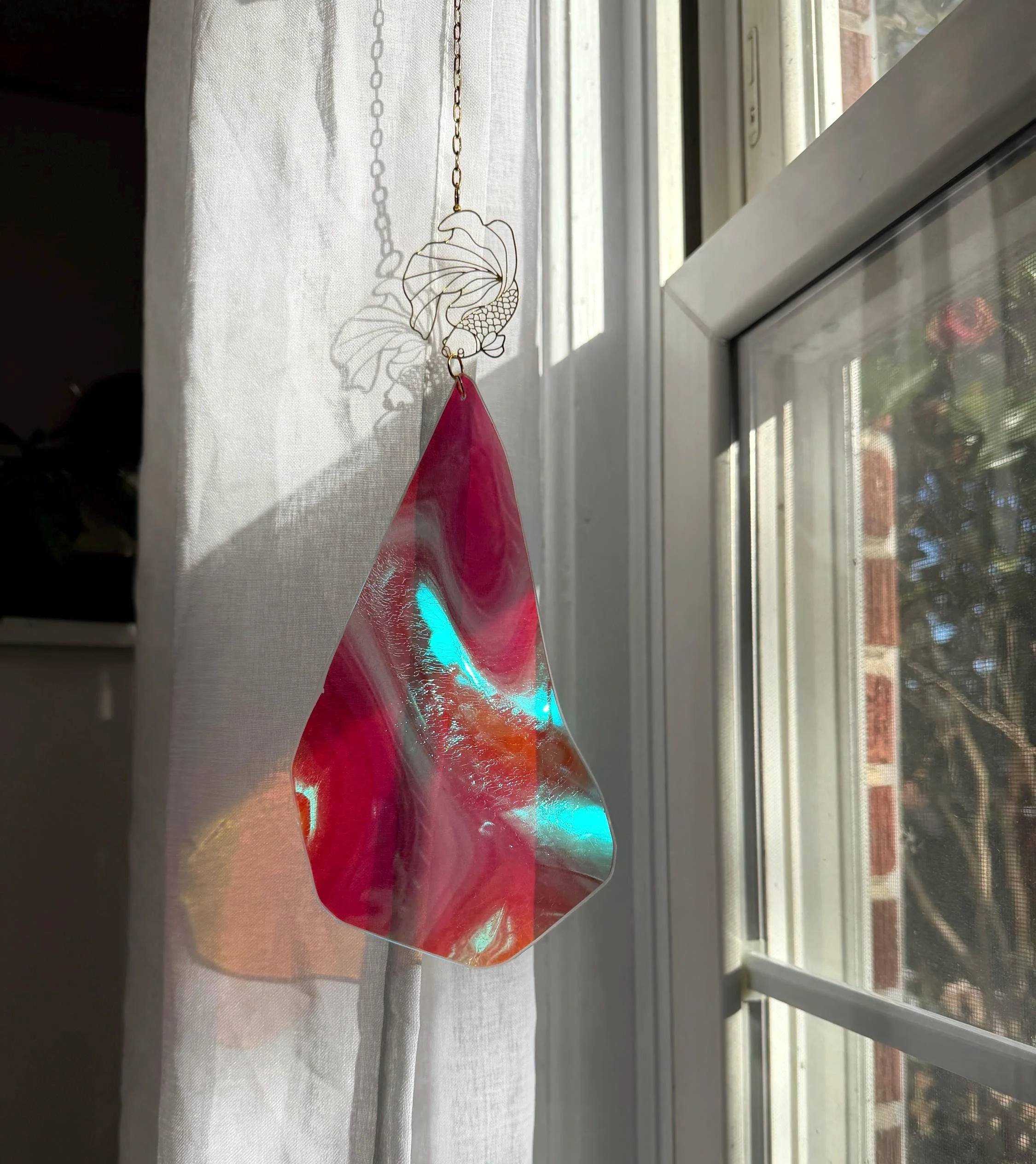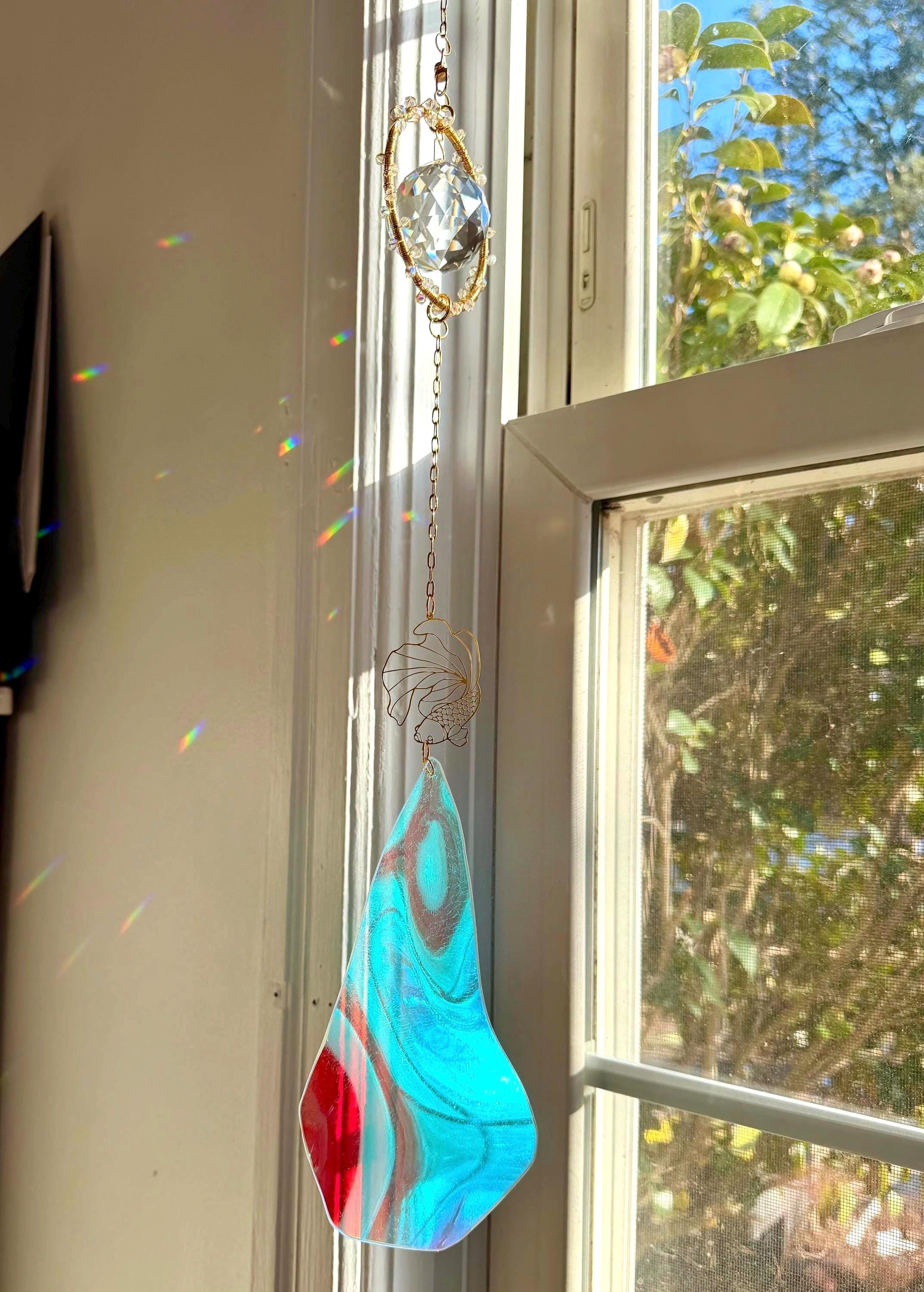 This handmade suncatcher features iridescent dichroic glass that shifts between aqua, coral, gold, and fire tones as the light moves—casting luminous reflections across walls and floors. Each angle tells a different story.